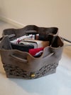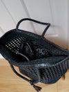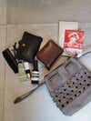 大きめのレザーメッシュバッグに荷物をまとめて、