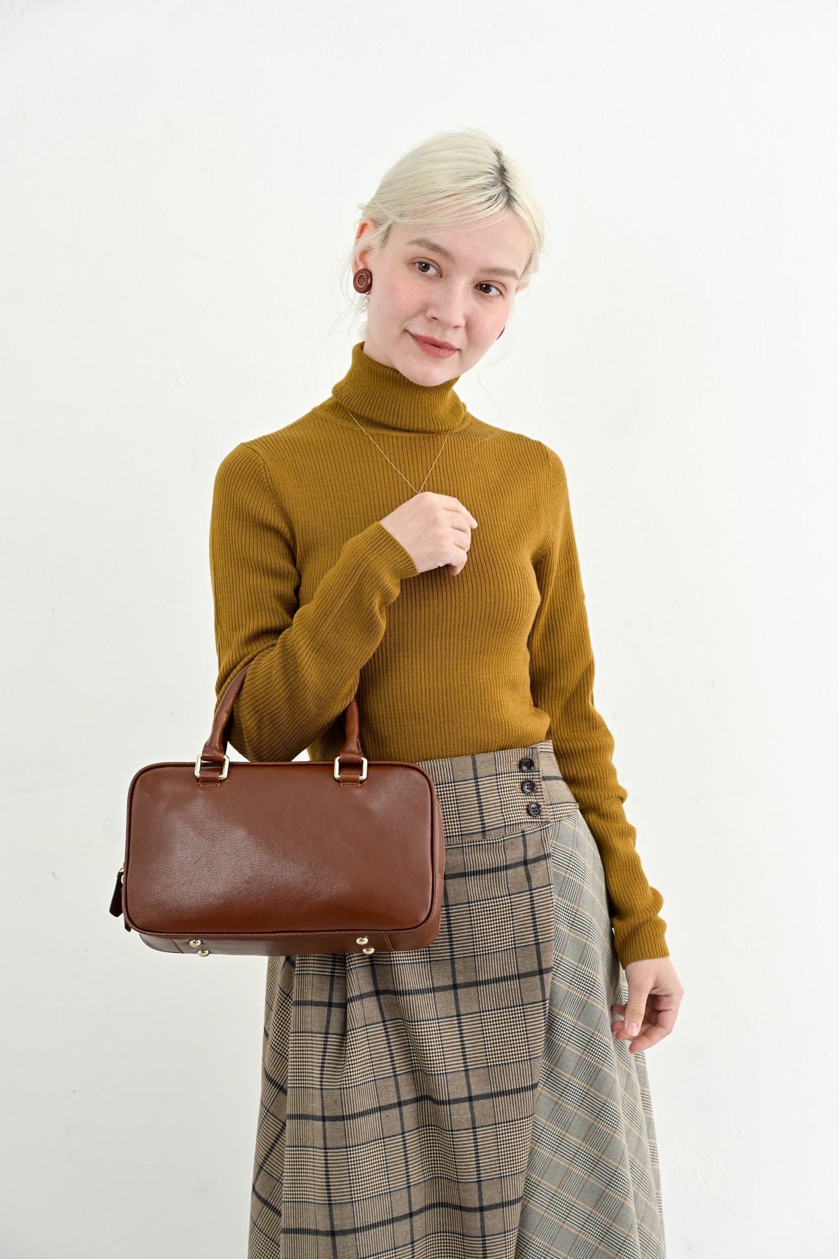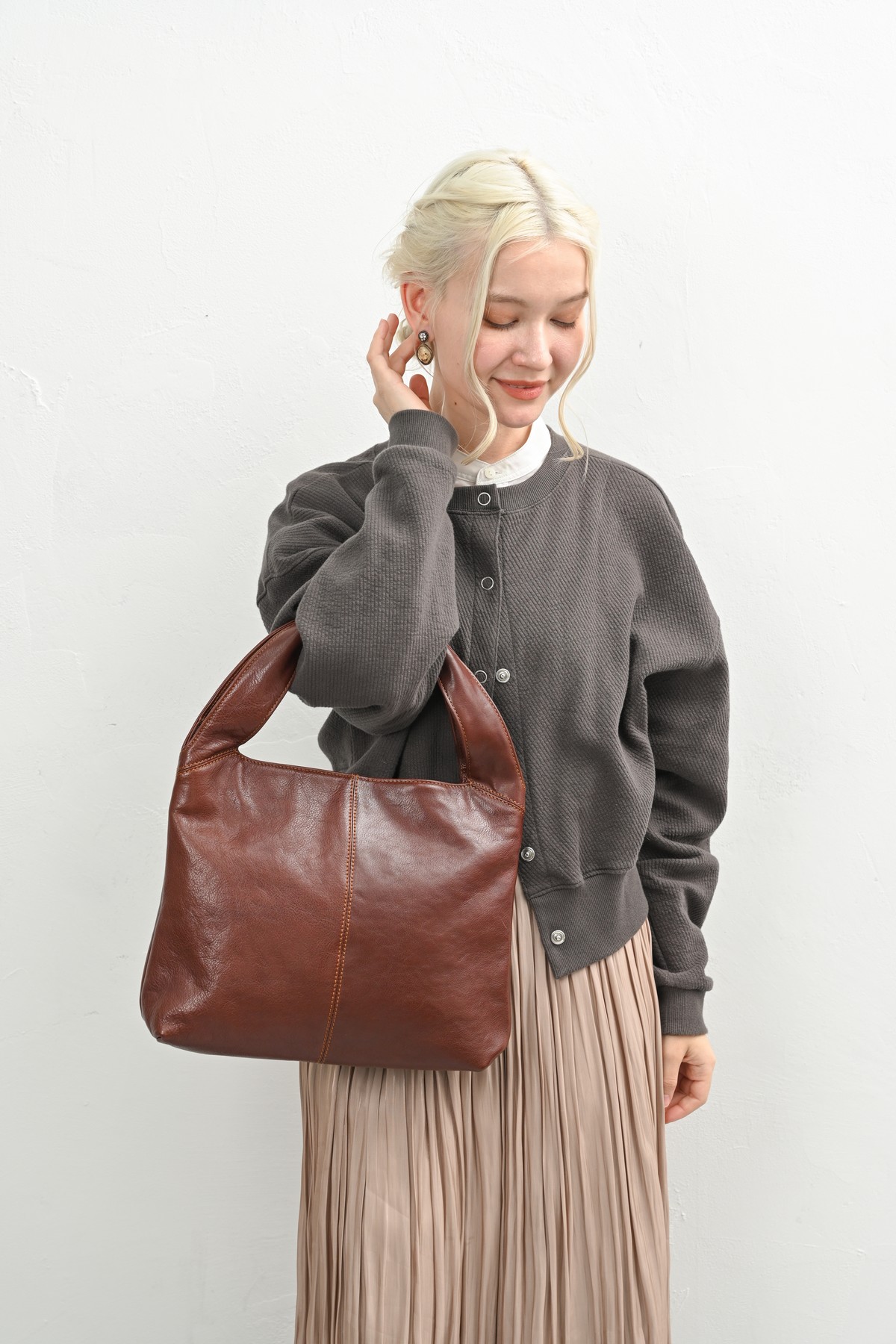 シックな秋のコーディネートに重厚感をプラスしてくれる本革のバッグ。