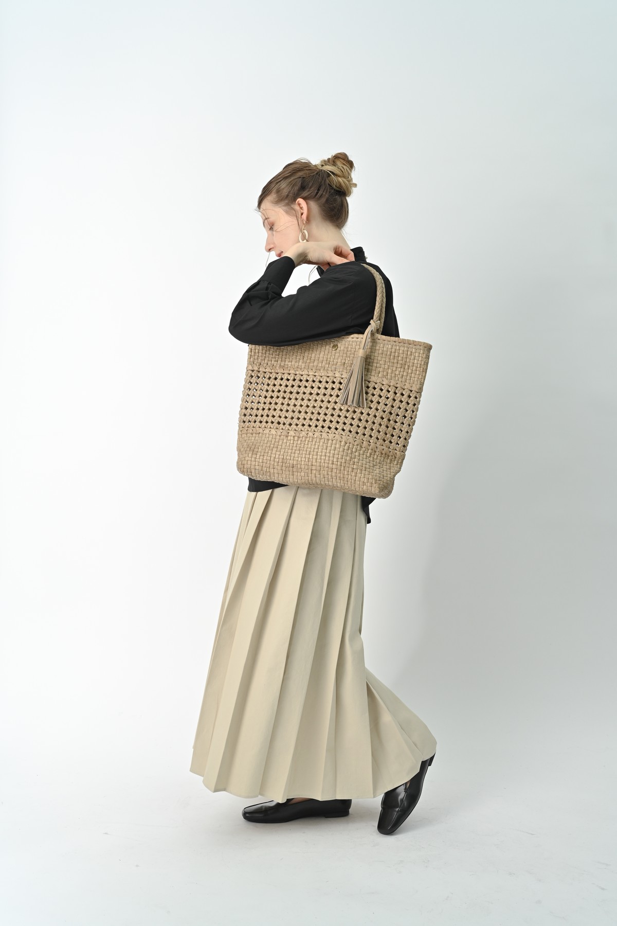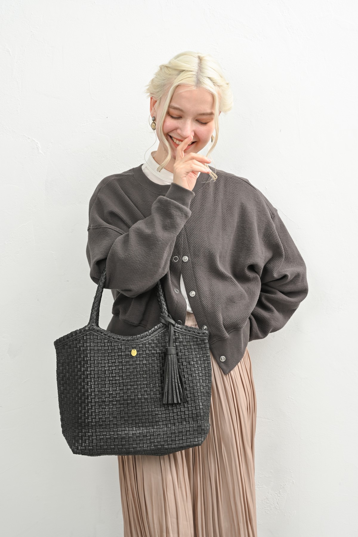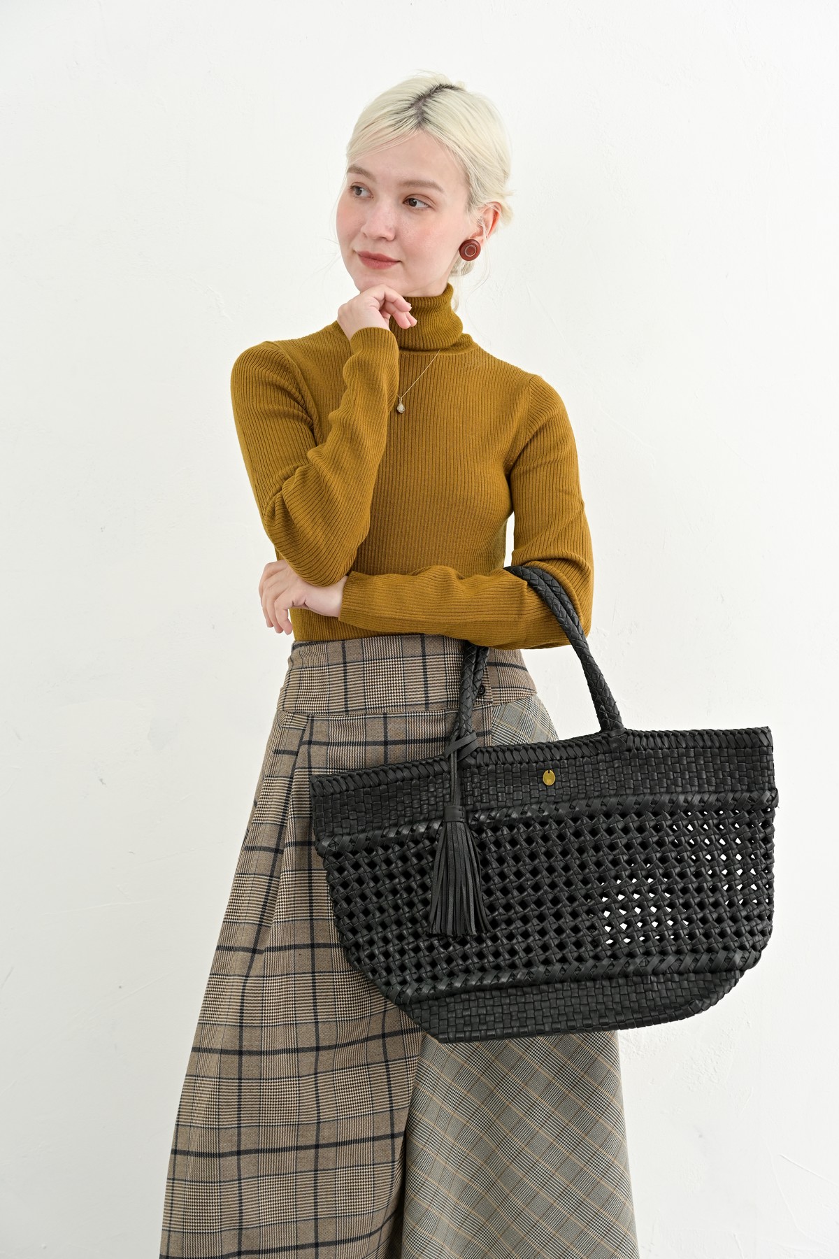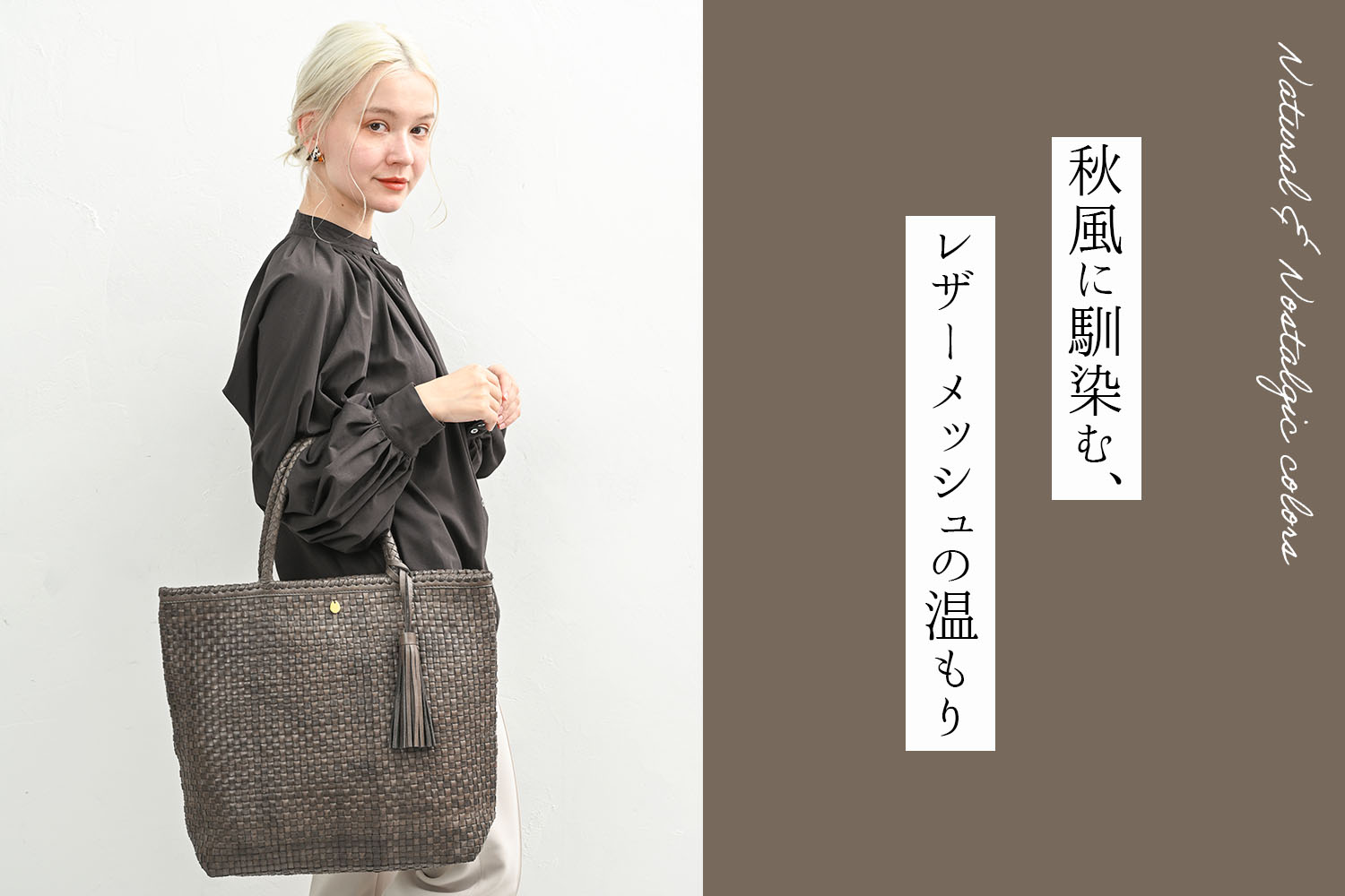 編み込まれたレザーが秋の空気にしっとりと溶け込み、