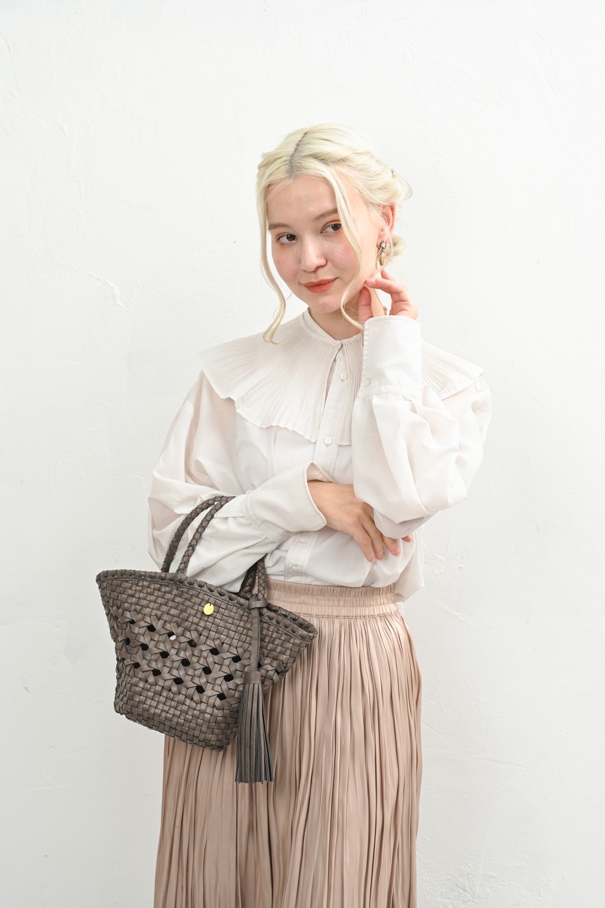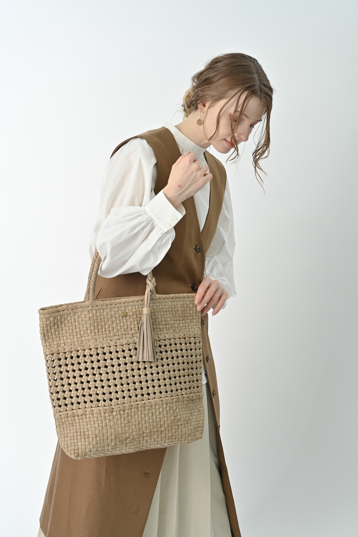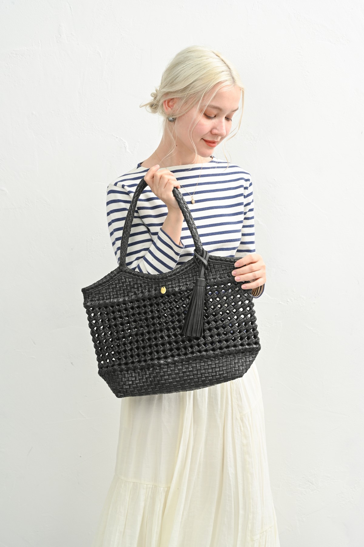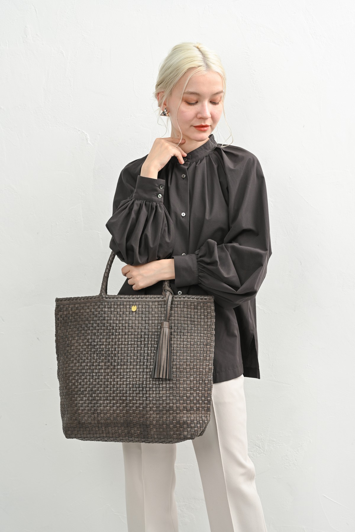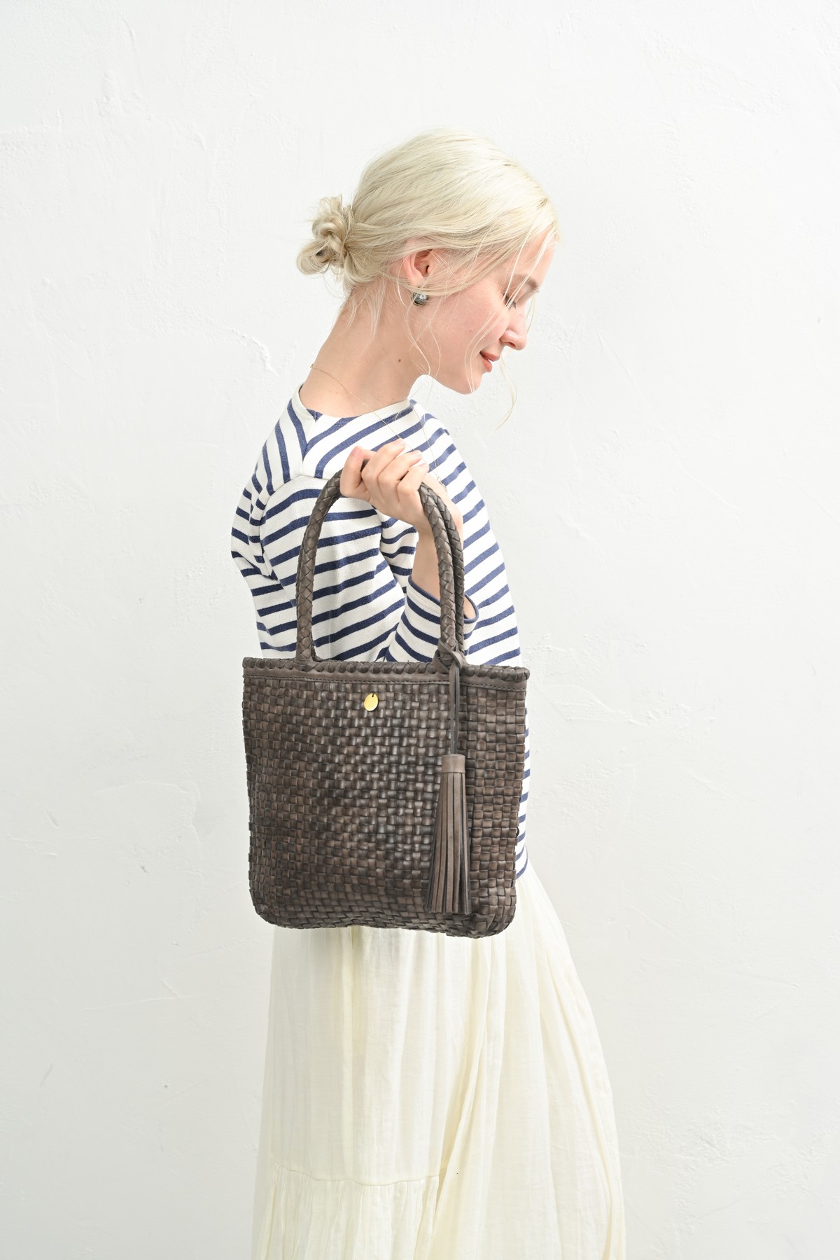 編み込まれたレザーが秋の空気にしっとりと溶け込み、