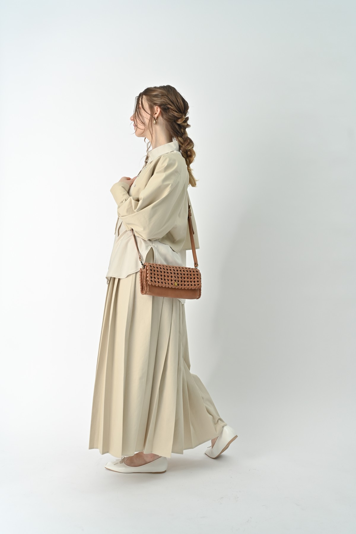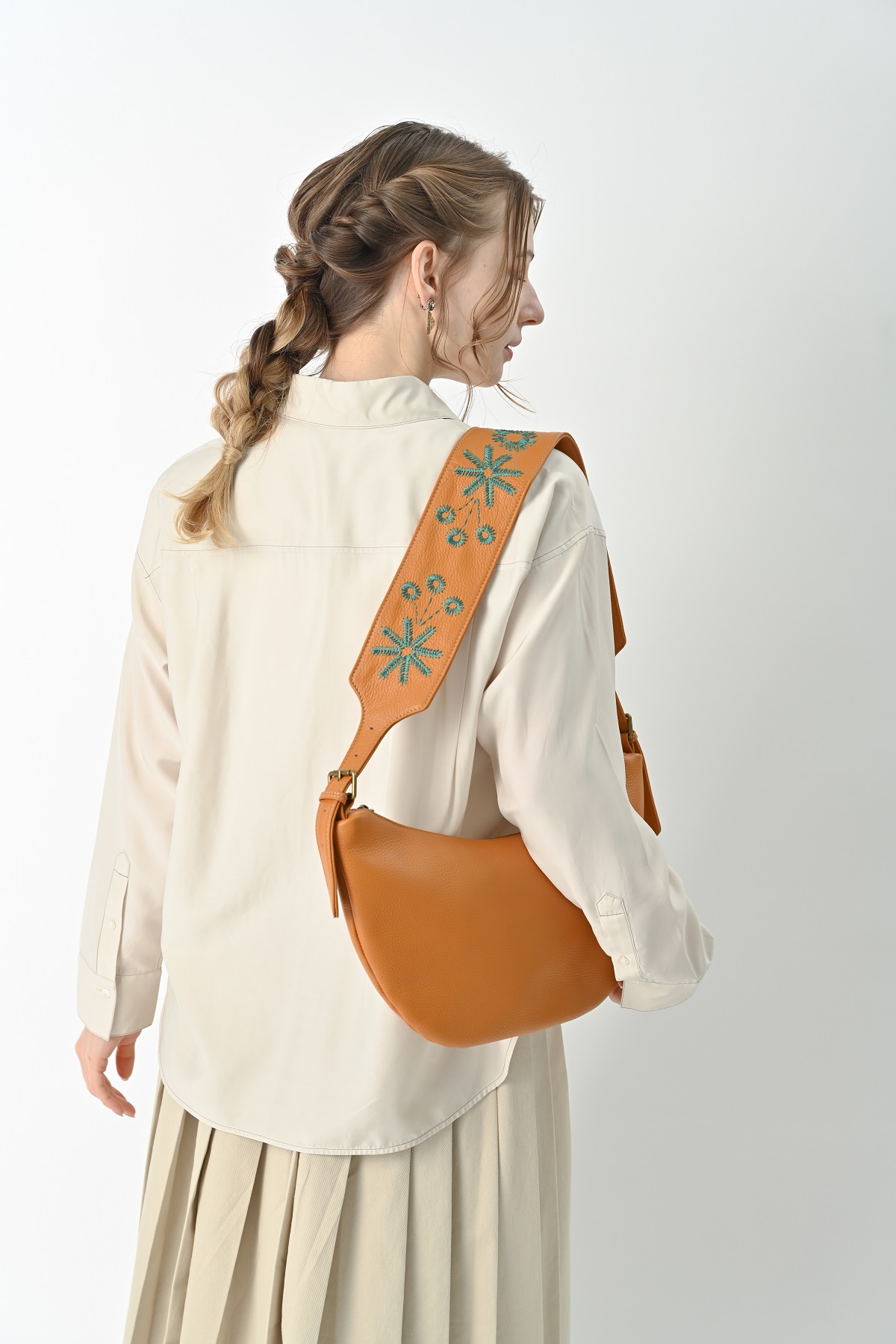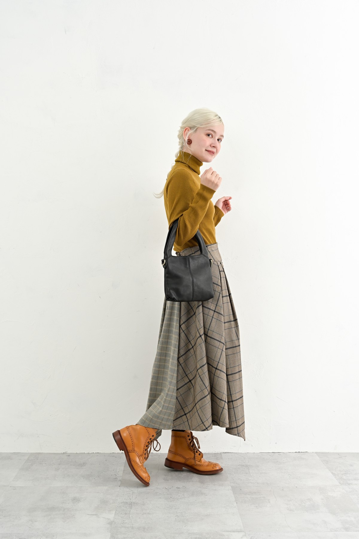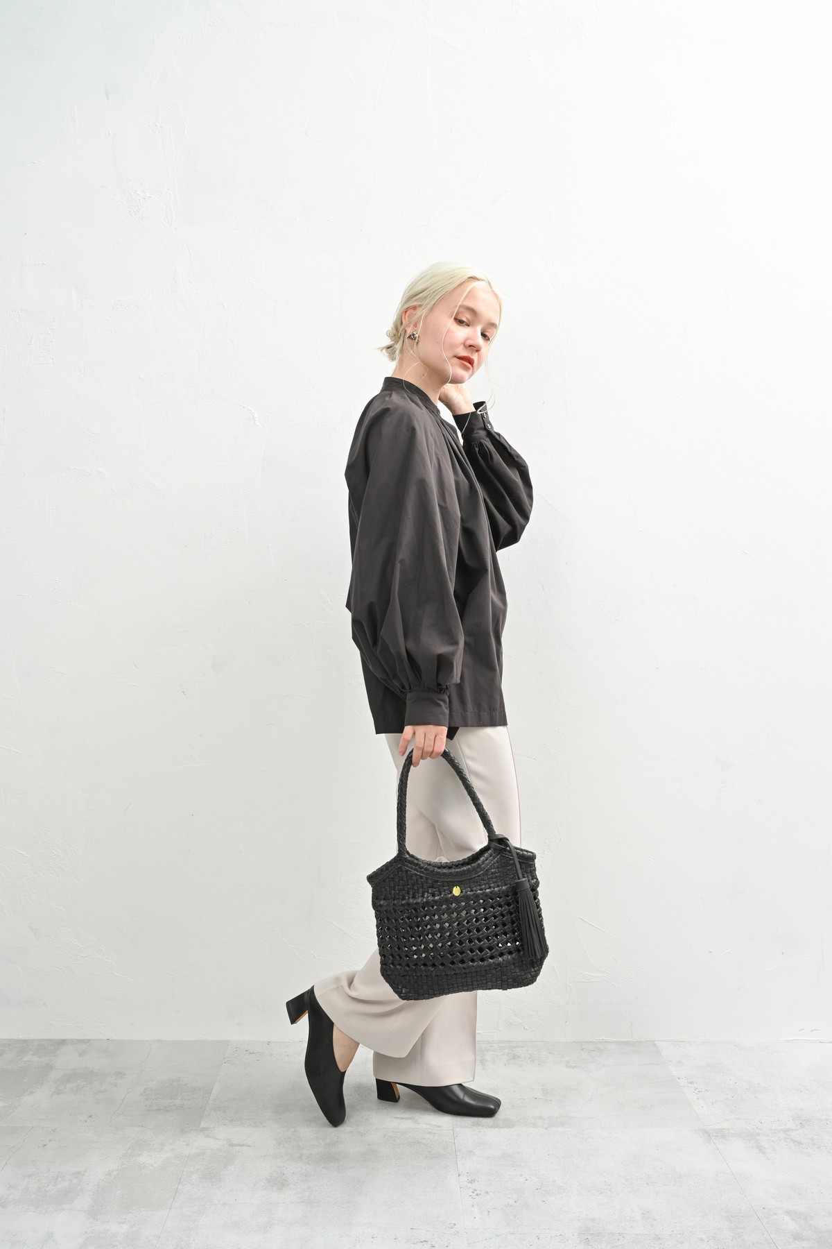 編み込まれたレザーが秋の空気にしっとりと溶け込み、