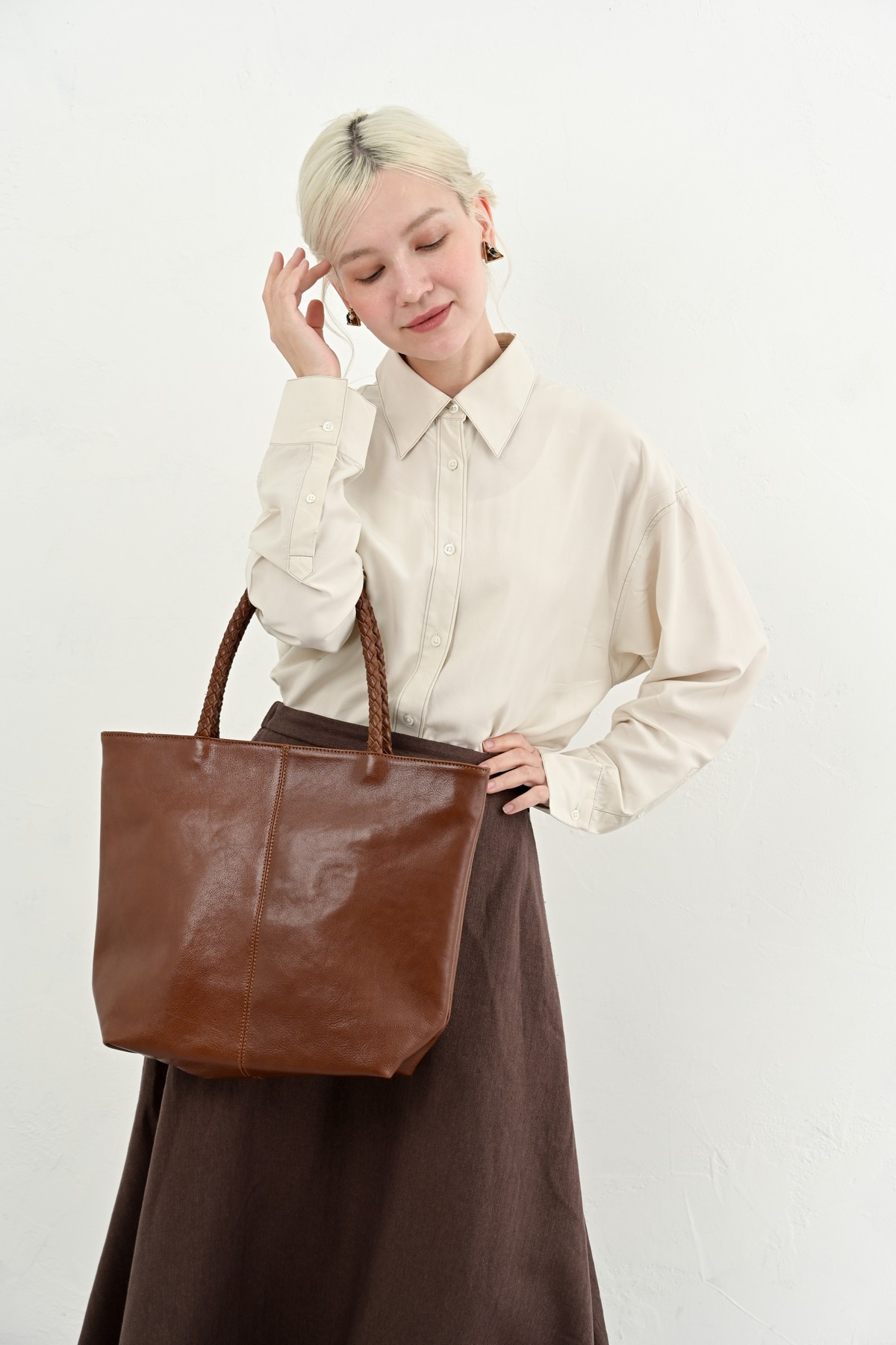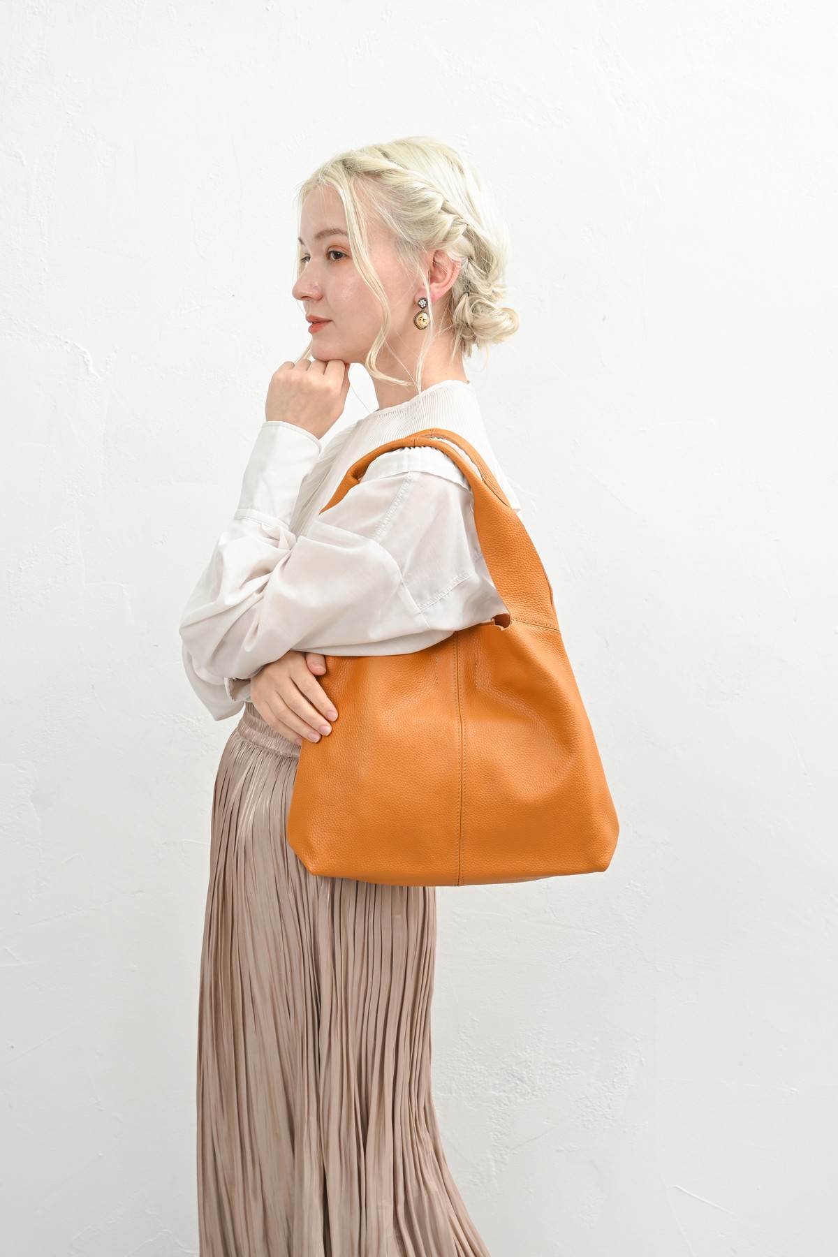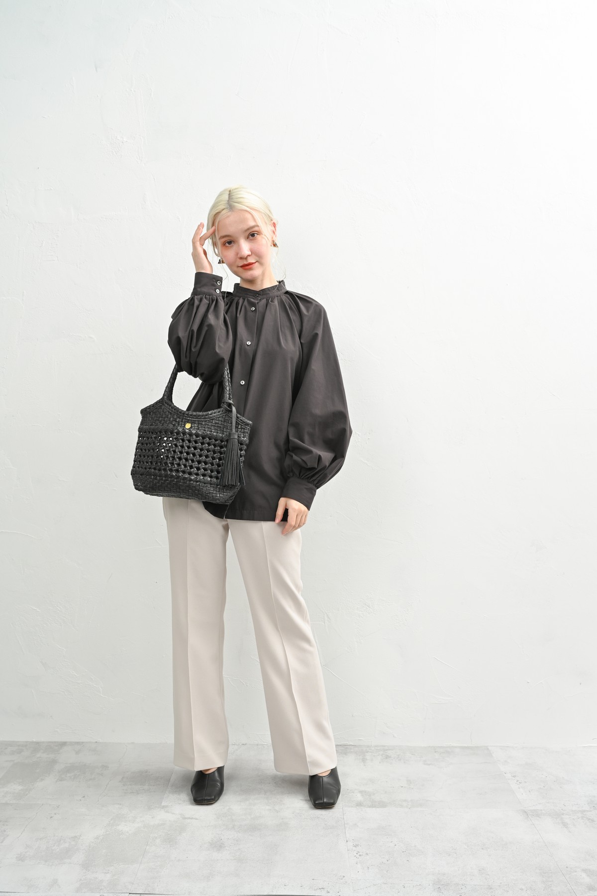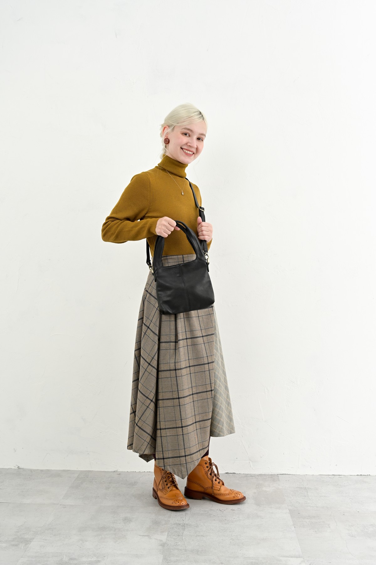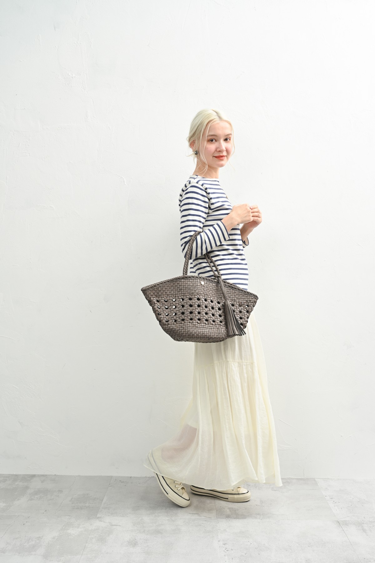 編み込まれたレザーが秋の空気にしっとりと溶け込み、