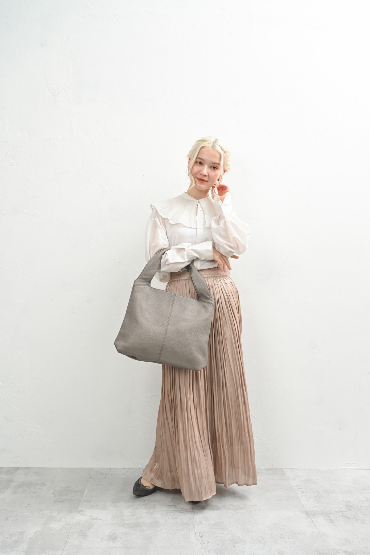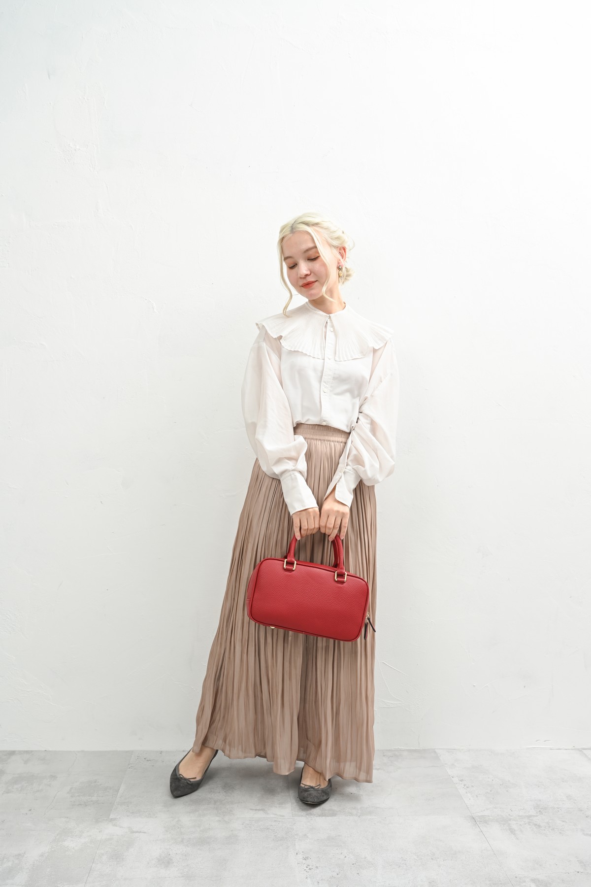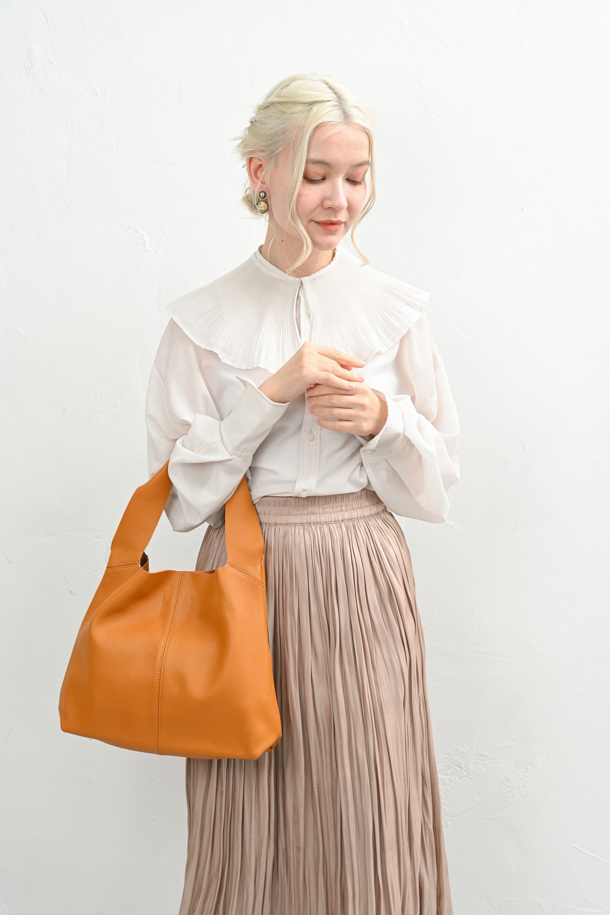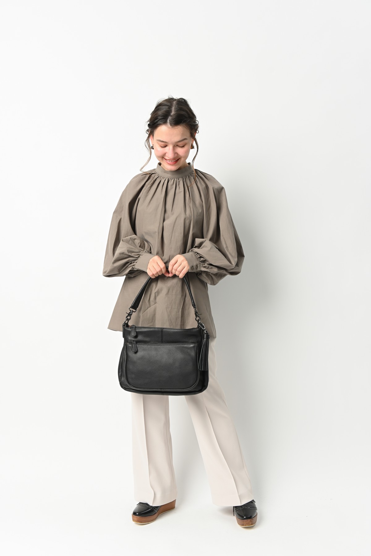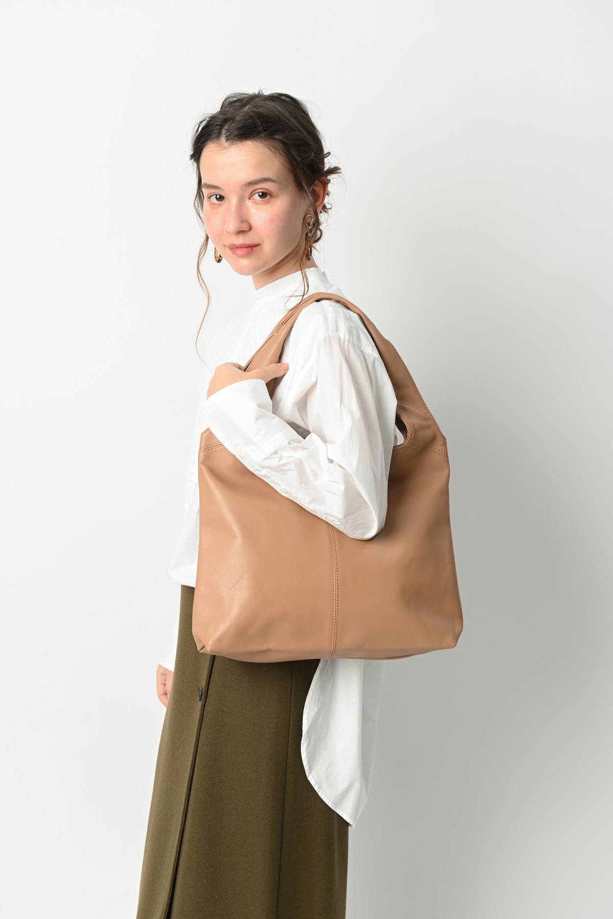 エレガントな雰囲気を持つラム革バッグは秋の大人コーデに良く似合う。