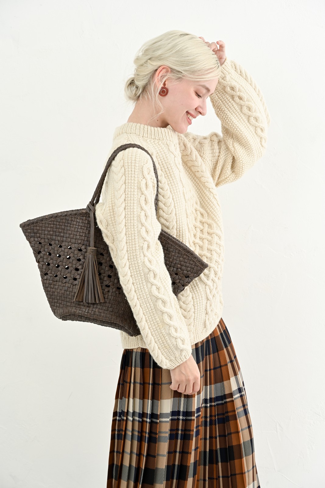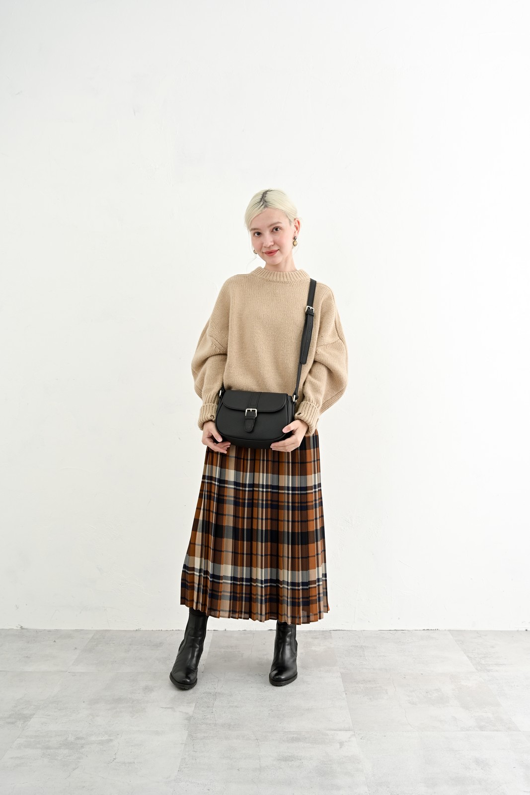 チェックのスカートに寄り添う柔らかな質感と、