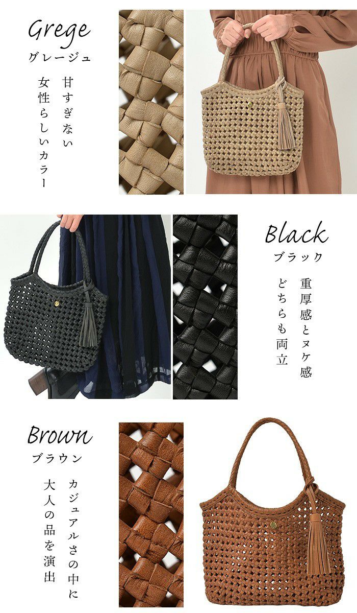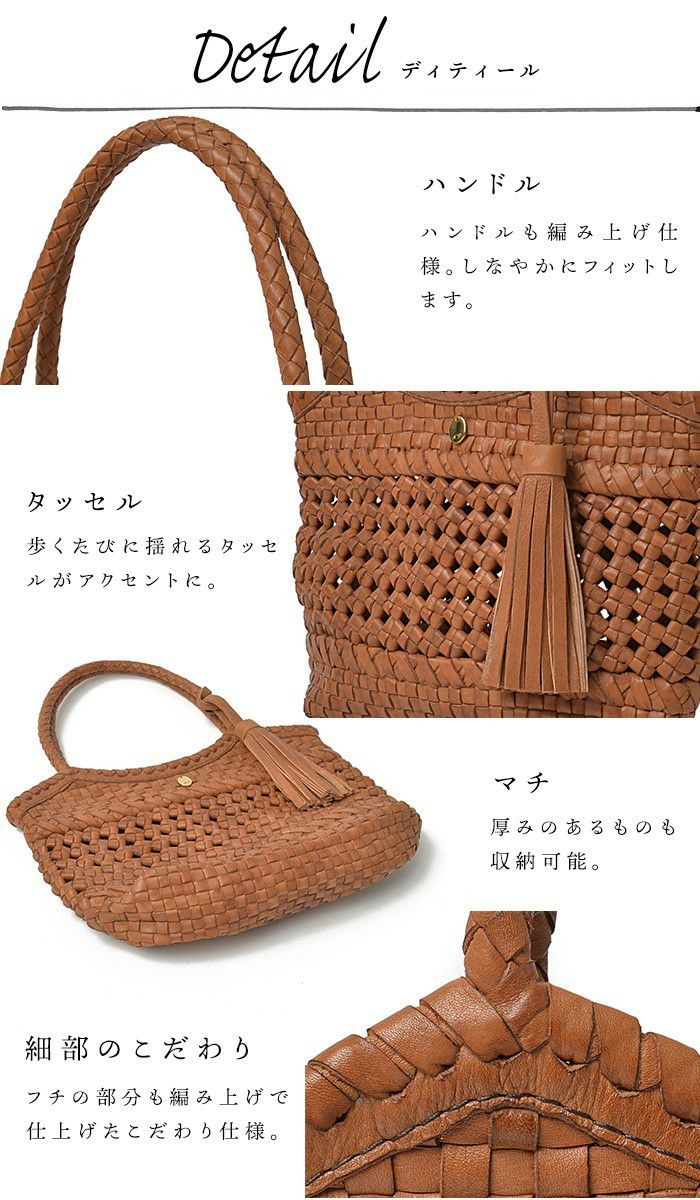 他の画像を見る すべてが職人の手編みによるクラフト感溢れるレザーメッシュトートバッグシリーズ。 ライザ・フルメッシュ 柔らかい レザー メッシュバッグ 大容量 本革バッグ 花結び編み 商品価格 ¥ 56,980 税込 カートに入れる お気に入りに登録する